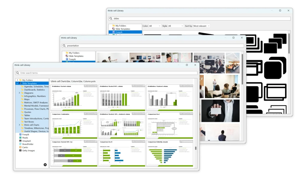think-cell 的库是您在 PowerPoint 中方便地搜索资产的中心枢纽。访问数百万张高质量图像、图标和专业幻灯片模板 – 同时保持在您的工作流程中。无缝重用幻灯片,使用详细预览进行搜索,并使用强大的过滤器优化结果。无需安装服务器 – 只需连接您的文件夹并轻松利用您的资产。