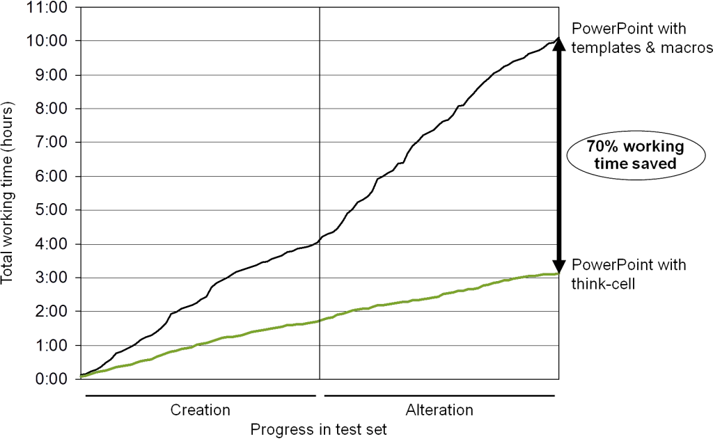 一家先进先的咨询公司量化了 think-cell 对图表制作的影响。他们经验丰富的图形专家之一使用 PowerPoint 创建并更新了 48 张典型幻灯片。整个过程花了他 10 多个小时 。
