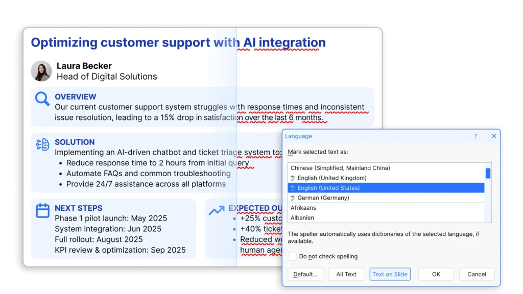 - 通过自动化结构、布局和样式高效创建演示文稿。