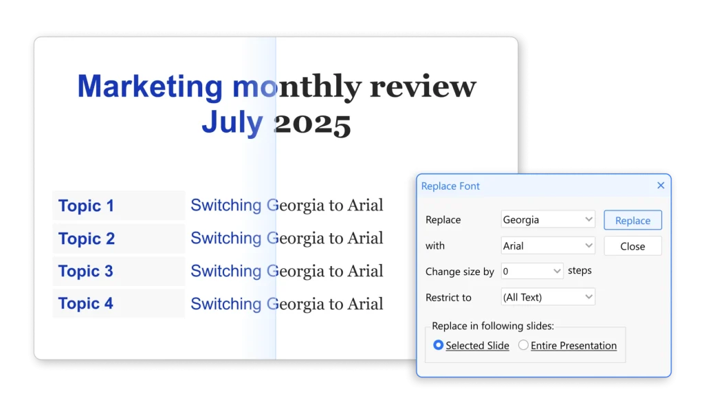 您的演示文稿会自动适应变化,即使经过多轮编辑,也能保持结构化、逻辑性和品牌化。